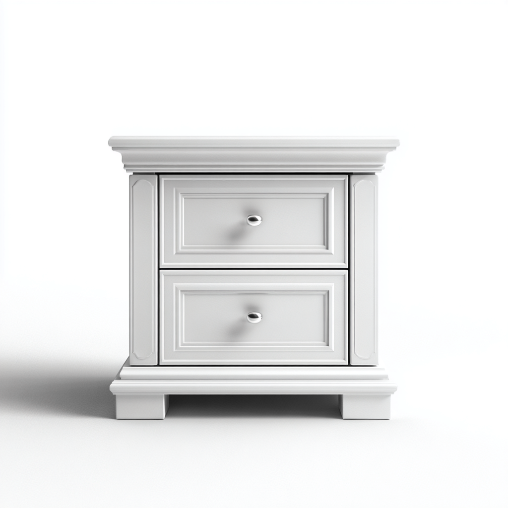 Realizzato in MDF con finitura bianca uniforme, il comodino presenta superfici lisce e dettagli lavorati che valorizzano l'estetica complessiva. La struttura è solida e adatta all'uso quotidiano in ambito domestico.