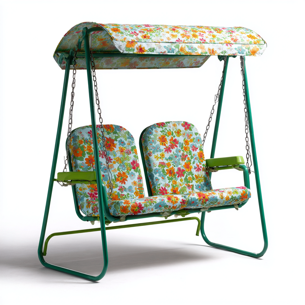 La struttura è realizzata in metallo verniciato verde, progettato per garantire solidità e stabilità nel tempo. La seduta e la copertura superiore sono rivestite in tessuto con motivo floreale, con finiture curate per un utilizzo quotidiano in ambiente esterno.