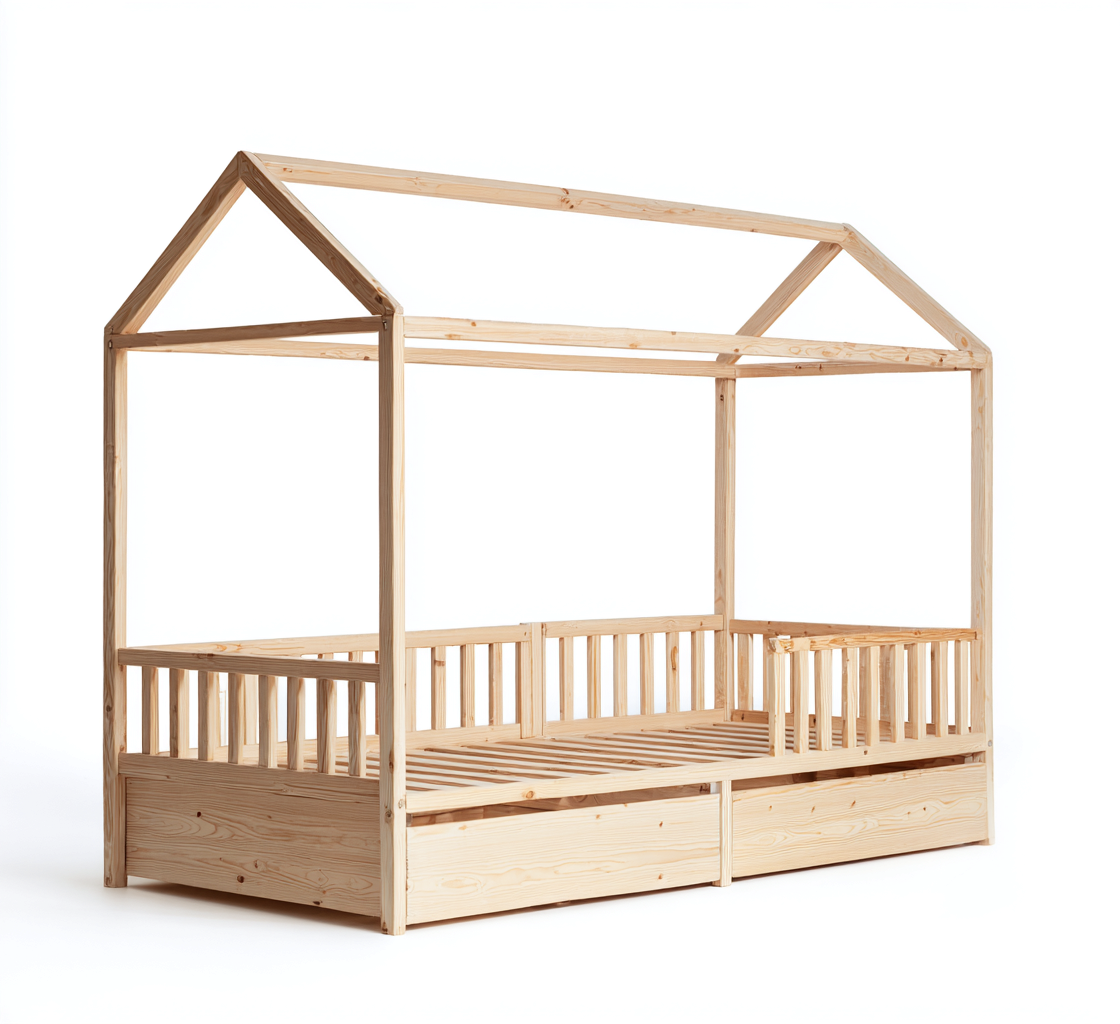 - 1 x Letto per bambini in legno con struttura a casetta e sponde