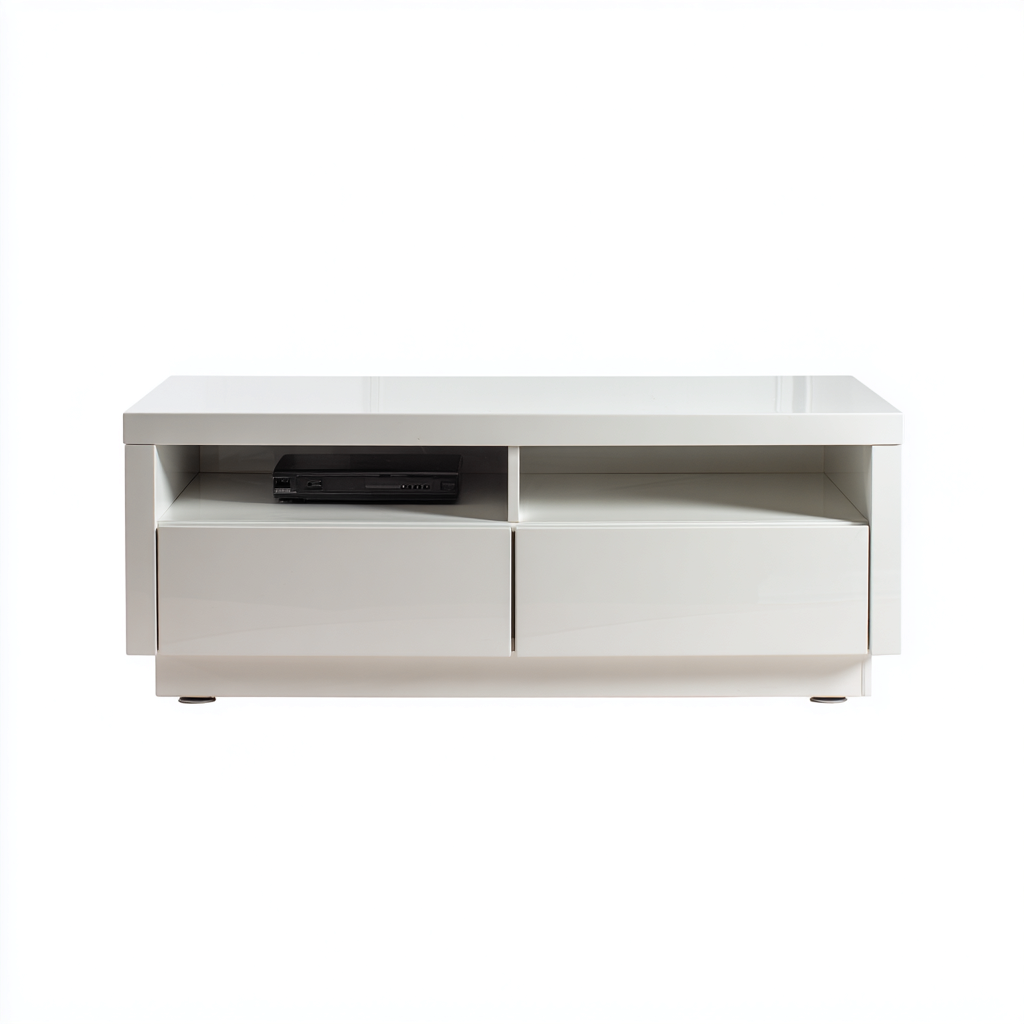 Questo mobile TV è progettato per ambienti living moderni, offrendo una base funzionale ed elegante per il televisore e i dispositivi multimediali. Il profilo basso e le superfici lineari contribuiscono a creare un aspetto ordinato e luminoso nel soggiorno.