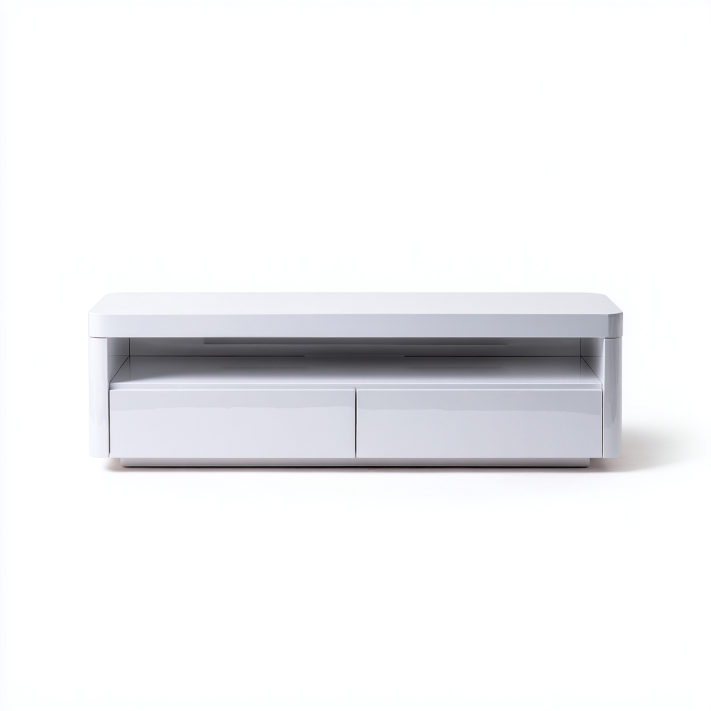 Questo mobile TV dal design essenziale è progettato per ambienti living moderni, offrendo una soluzione funzionale ed elegante per il posizionamento del televisore e dei dispositivi multimediali. La struttura compatta e le superfici lisce contribuiscono a creare un aspetto ordinato e contemporaneo.
