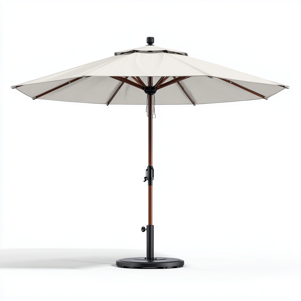 La struttura è realizzata in metallo con finitura scura, studiata per garantire stabilità e resistenza. Il palo centrale è abbinato a stecche di supporto robuste. La copertura è in tessuto di colore beige, selezionato per un utilizzo affidabile in ambienti esterni.