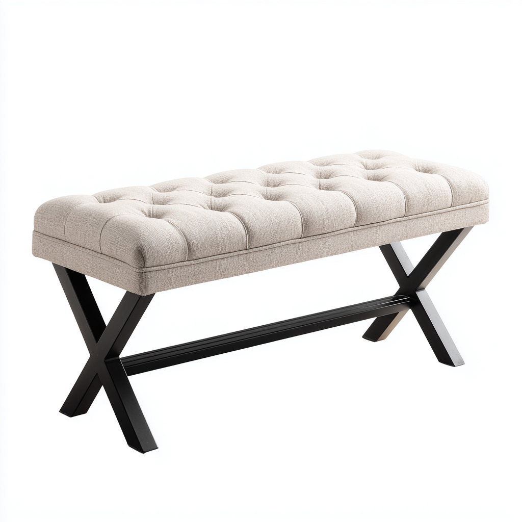 Questa panca per letto è pensata per completare la zona notte offrendo una seduta pratica ai piedi del letto. Il rivestimento in tessuto beige e la base con struttura a X conferiscono un aspetto equilibrato e adatto a interni moderni e contemporanei.