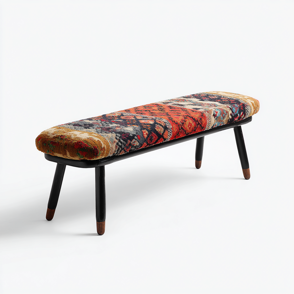 Questa panca per letto è progettata per arricchire la zona notte con un elemento funzionale e decorativo. Il rivestimento in tessuto multicolore con motivi artistici dona carattere all'ambiente, rendendola adatta a camere da letto moderne o spazi dallo stile creativo.