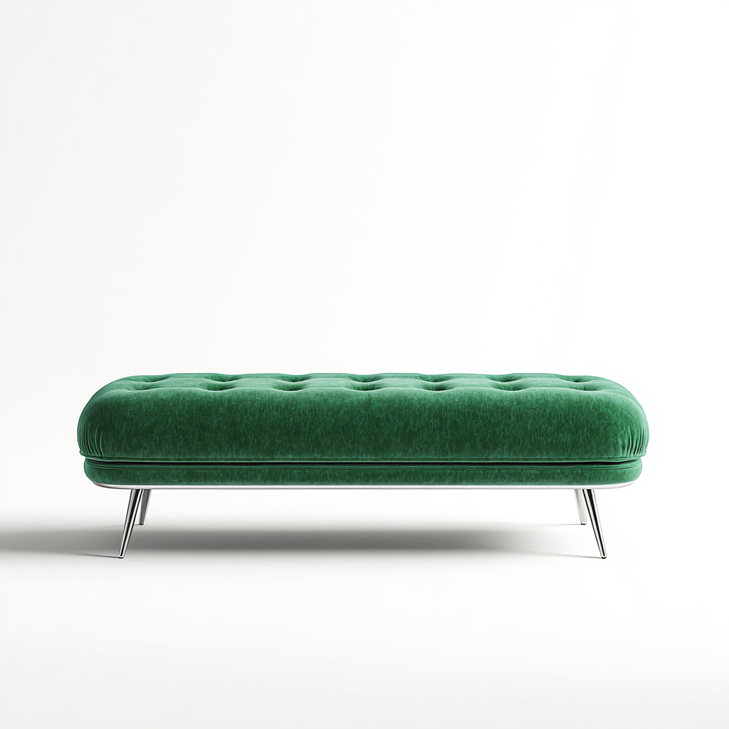 La seduta è rivestita in velluto di colore verde con lavorazione trapuntata uniforme, mentre la struttura di supporto è realizzata in metallo con finitura argento. L'imbottitura è distribuita in modo omogeneo per garantire comfort e stabilità nel tempo.