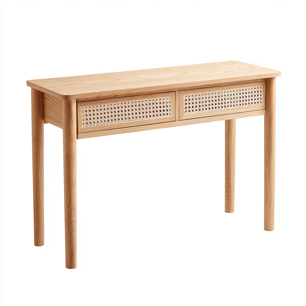 La struttura è realizzata interamente in legno con finitura naturale, che valorizza le venature del materiale. I frontali dei cassetti sono arricchiti da inserti in rattan intrecciato, lavorati con cura per garantire un'estetica equilibrata e una buona resistenza all'uso quotidiano.