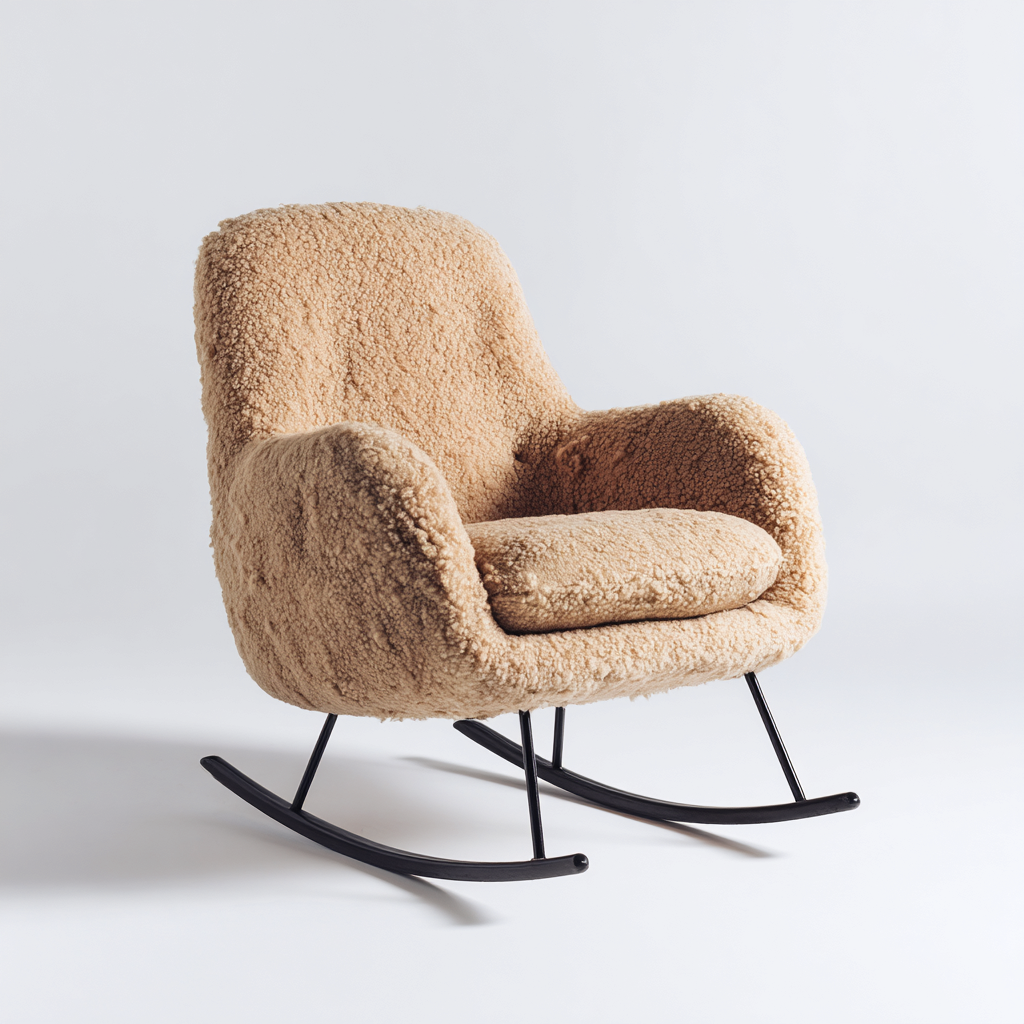 La seduta è rivestita in tessuto effetto montone color beige, soffice al tatto e visivamente caldo. La struttura portante è realizzata in metallo verniciato nero, completata da pattini curvi coordinati che assicurano un'oscillazione regolare e una buona stabilità.